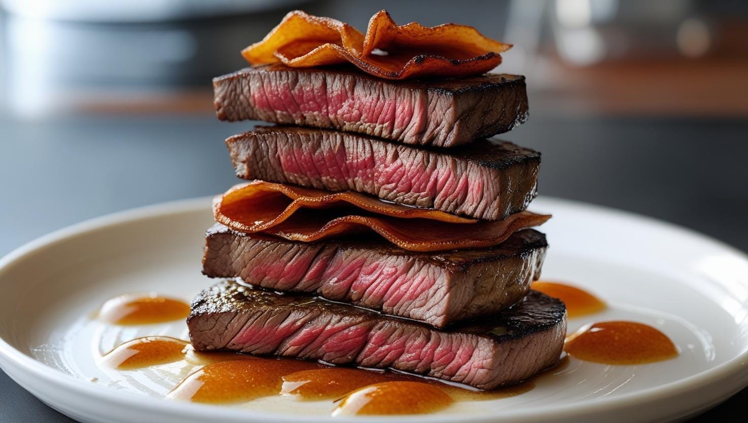 Rétegezd a steak és a máj szeleteket torony formában a tányéron.